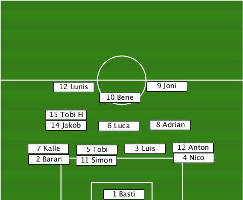 ---------------------9 Joni------ --------12 Lunis----------------- ---------------10 Bene----------- -------15 Tobi H----------------- -------14 Jakob-6 Luca-8 Adrian---- -----7 Kalle-5 Tobi-3 Luis-12 Anton- -----2 Baran-11 Simon-----4 Nico--- ---------------1 Basti-----------
