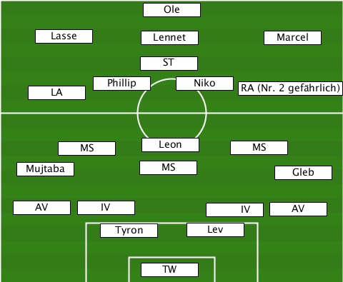 ---------------Ole--------------- -----Lasse------Lennet------Marcel- ---------------ST---------------- ----LA-----Phillip--Niko---RA (Nr. 2 gefährlich) -------MS-------Leon-----MS-------- ---Mujtaba-----MS------------Gleb-- ---AV-----IV-----------IV-----AV---- -----------Tyron----Lev----------- ---------------TW----------------