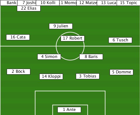--------------11 Momo------------ --Bank:-7 Joshi-10 Kolli-12 Matze-13 Luca-15 Topic -----22 Elias-------------------- -------------9 Julien------------ ---16 Cata------17 Robert---6 Tusch ----------4 Simon----8 Baris------ ---2 Böck--14 Kloppi-3 Tobias-5 Domme ---------------1 Ante------------