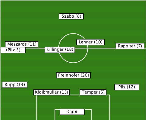 --------------Szabo (8)---------- --(Pilz 5)-Meszaros (11)-Killinger (18)-Lehner (10)-Rapolter (7) --------------Freinhofer (20)---- --Rupp (14)-----------------Pils (12) ---------Kloibmüller (15)-Temper (6) ---------------Gubi--------------