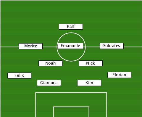 ---------------Ralf-------------- ------Moritz---Emanuele---Sokrates- ----------Noah------Nick---------- ---Felix-------------------Florian ----------Gianluca--Kim-----------
