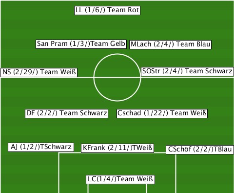 ------------LL (1/6/) Team Rot--- ------San Pram (1/3/)Team Gelb-MLach (2/4/) Team Blau --NS (2/29/) Team Weiß-SOStr (2/4/) Team Schwarz -----DF (2/2/) Team Schwarz-Cschad (1/22/) Team Weiß ---AJ (1/2/)TSchwarz-KFrank (2/11/)TWeiß-CSchöf (2/2/)TBlau -------------LC(1/4/)Team Weiß---