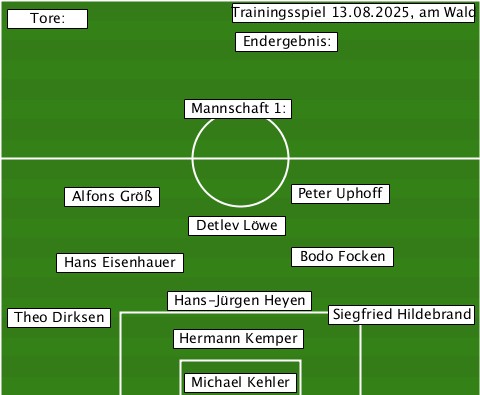 -----------------Trainingsspiel 13.08.2025, am Wald --Tore:-------------------------- -----------------Endergebnis:---- --------------Mannschaft 1:------ ------Alfons Größ-----Peter Uphoff --------------Detlev Löwe-------- -----Hans Eisenhauer--Bodo Focken- --Theo Dirksen-Hans-Jürgen Heyen-Siegfried Hildebrand -------------Hermann Kemper------ --------------Michael Kehler-----