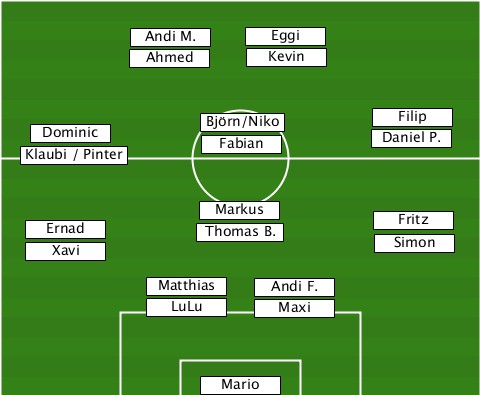 ------------------Eggi----------- ----------Andi M.---------------- ----------Ahmed----Kevin---------- ---Klaubi / Pinter-Dominic-Björn/Niko-Fabian-Daniel P.-Filip ---Ernad-Xavi----Thomas B.-Markus-Fritz-Simon -----------Matthias-Andi F.------- -----------LuLu----Maxi----------- ---------------Mario-------------