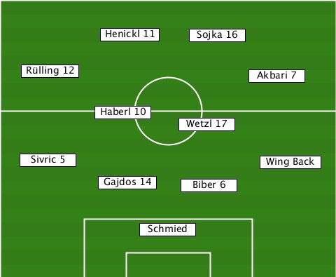 -----------Henickl 11------------ -------------------Sojka 16------ ---Rülling 12-------------Akbari 7 ----------Haberl 10-------------- ------------------Wetzl 17------- ---Sivric 5----------------Wing Back -----------Gajdos 14-Biber 6------ ---------------Schmied-----------