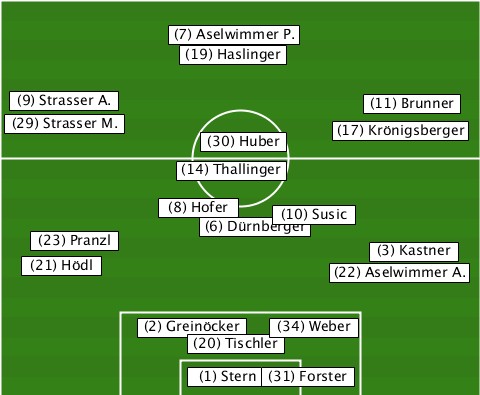 -------------(7) Aselwimmer P.--- -------------(19) Haslinger------ --(9) Strasser A.----------(11) Brunner --(29) Strasser M.-(30) Huber-(17) Krönigsberger -------------(14) Thallinger----- ---(21) Hödl-(23) Pranzl-(8) Hofer-(6) Dürnberger-(10) Susic-(22) Aselwimmer A.-(3) Kastner -----------(2) Greinöcker-(34) Weber --------------(20) Tischler------ --------------(1) Stern-(31) Forster