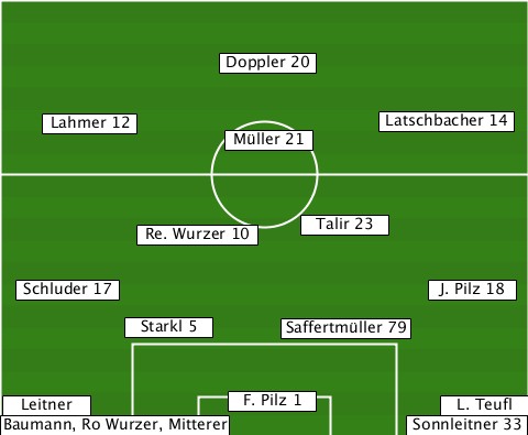---------------Doppler 20-------- ----Lahmer 12------------Latschbacher 14 ---------------Müller 21--------- ----------Re. Wurzer 10-Talir 23-- --Schluder 17---------------J. Pilz 18 ---------Starkl 5--Saffertmüller 79 --Leitner-------F. Pilz 1-----L. Teufl -Baumann, Ro Wurzer, Mitterer-Sonnleitner 33
