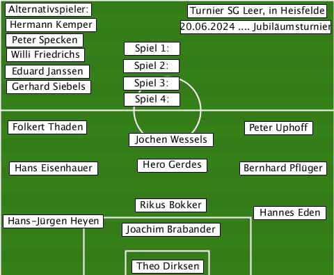 --Alternativspieler:------------- -------------------Turnier SG Leer, in Heisfelde --Hermann Kemper----20.06.2024 .... Jubiläumsturnier --Peter Specken-Willi Friedrichs-Spiel 1: --Eduard Janssen-Spiel 2:--------- --Gerhard Siebels-Spiel 3:-------- -------------Spiel 4:------------ --Folkert Thaden----------Peter Uphoff --------------Jochen Wessels----- --Hans Eisenhauer-Hero Gerdes-Bernhard Pflüger --Hans-Jürgen Heyen-Joachim Brabander-Rikus Bokker-Hannes Eden --------------Theo Dirksen-------