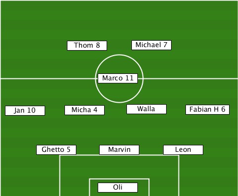-------------------Michael 7----- ----------Thom 8----------------- ---------------Marco 11---------- --Jan 10---Micha 4--Walla----Fabian H 6 ------Ghetto 5--Marvin---Leon------ ---------------Oli---------------