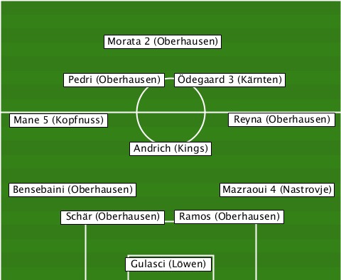 -----------Morata 2 (Oberhausen)- -------Pedri (Oberhausen)-Ödegaard 3 (Kärnten) --Mane 5 (Kopfnuss)-----Reyna (Oberhausen) --------------Andrich (Kings)---- --Bensebaini (Oberhausen)-Mazraoui 4 (Nastrovje) -------Schär (Oberhausen)-Ramos (Oberhausen) -------------Gulasci (Löwen)-----