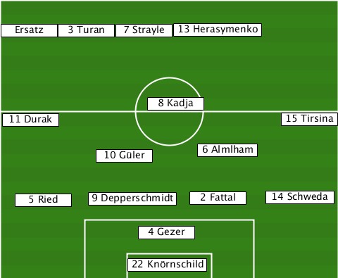 ------------------13 Herasymenko- --Ersatz-3 Turan-7 Strayle--------- ---------------8 Kadja----------- --11 Durak-------------------15 Tirsina -----------10 Güler--6 Almlham---- ---5 Ried--9 Depperschmidt-2 Fattal-14 Schweda ---------------4 Gezer----------- --------------22 Knörnschild-----