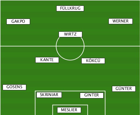 --------------Füllkrug----------- ---Gakpo-------------------Werner- ---------------Wirtz------------- ----------Kante------Kökcü-------- --Gosens--------------------Günter ----------Skriniar---Ginter------- ---------------Meslier-----------