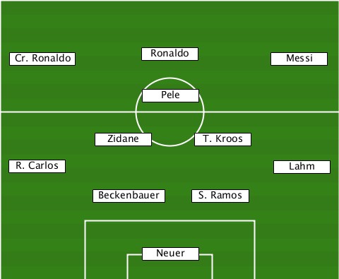 ---------------Ronaldo----------- --Cr. Ronaldo---------------Messi- ---------------Pele-------------- ----------Zidane-----T. Kroos----- --R. Carlos-----------------Lahm-- ----------Beckenbauer-S. Ramos---- ---------------Neuer-------------