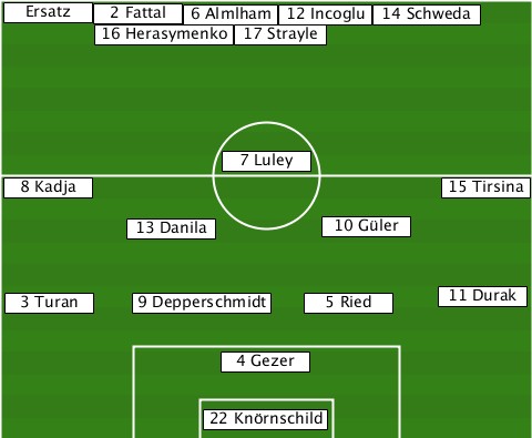 --Ersatz------------------------- -------2 Fattal-6 Almlham-12 Incoglu-14 Schweda -------16 Herasymenko-17 Strayle-- ---------------7 Luley----------- --8 Kadja--------------------15 Tirsina ---------13 Danila----10 Güler---- --3 Turan-9 Depperschmidt-5 Ried-11 Durak ---------------4 Gezer----------- --------------22 Knörnschild-----