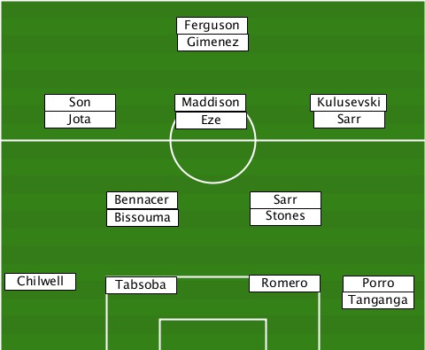 ---------------Ferguson---------- ---------------Gimenez----------- -----Son--------Maddison---Kulusevski -----Jota-------Eze--------Sarr---- ---------Bennacer----Sarr--------- ---------Bissouma----Stones------- --Chilwell-Tabsoba----Romero--Porro- ---------------------------Tanganga