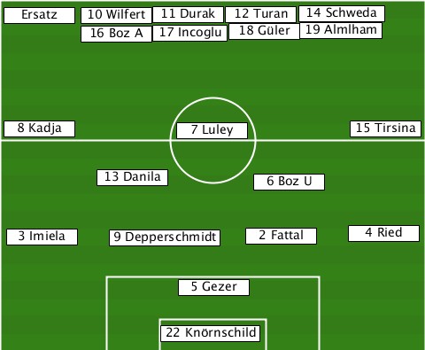 ------------------------14 Schweda --Ersatz-10 Wilfert-11 Durak-12 Turan --------16 Boz A-17 Incoglu-18 Güler-19 Almlham --8 Kadja-------7 Luley-------15 Tirsina ---------13 Danila----6 Boz U----- --3 Imiela-9 Depperschmidt-2 Fattal-4 Ried ---------------5 Gezer----------- --------------22 Knörnschild-----