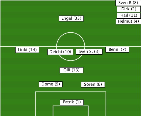 ----------------------------Sven B.(8) ----------------------------Dirk (2) ---------------Engel (33)----Helmut (4)-Hail (11) -----Linki (14)-Deichi (10)-Sven S. (3)-Benni (7) ---------------Olli (13)--------- ----------Dome (9)---Sören (6)---- ---------------Patrik (1)--------