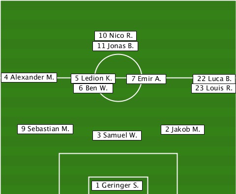 --------------10 Nico R.--------- --------------11 Jonas B.-------- --4 Alexander M.-5 Ledion K.-7 Emir A.-22 Luca B. -----------6 Ben W.---------23 Louis R. ----9 Sebastian M.-3 Samuel W.-2 Jakob M. --------------1 Geringer S.------