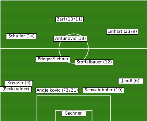 --------------Zarl (10/11)------- -------------------------Linhart (23/9) ---Schuller (14)-Antunovic (18)--- ---------Pfleger/Lehner-Stöffelbauer (12) ---Kreuzer (4)--------------Jandl (6) -(Becksteiner)-Andjelkovic (73/21)-Schweighofer (19) ---------------Bachner-----------