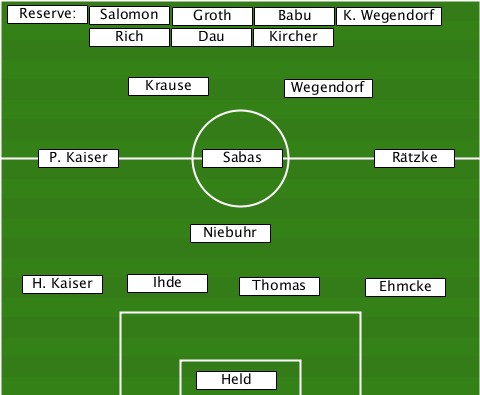 --Reserve:----------------------- -------Salomon-Groth-Babu--K. Wegendorf -------Rich---Dau---Kircher-------- ----------Krause-----Wegendorf---- ----P. Kaiser---Sabas-------Rätzke- --------------Niebuhr------------ ---H. Kaiser-Ihde--Thomas----Ehmcke- ---------------Held--------------