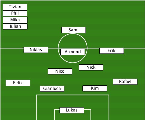 --Tizian------------------------- --Phil--------------------------- --Mika--------------------------- --Julian--------Sami-------------- -------Niklas---Armend---Erik------ ------------Nico----Nick---------- ---Felix-------------------Rafael- ----------Gianluca---Kim---------- ---------------Lukas-------------