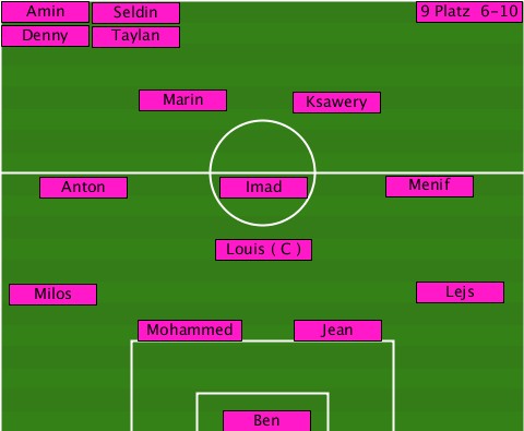 --Amin--------------------------- -------Seldin---------------9 Platz 6-10 --Denny-Taylan-------------------- ----------Marin-----Ksawery------- ----Anton-------Imad-------Menif--- ---------------Louis ( C )------- --Milos---------------------Lejs-- ----------Mohammed--Jean---------- ---------------Ben---------------