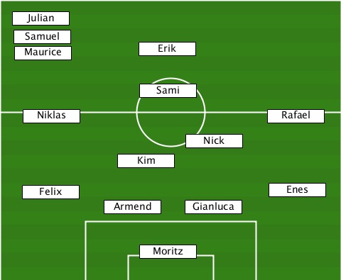 ---Julian------------------------ ---Samuel------------------------ ---Maurice-----Erik--------------- ---------------Sami-------------- ----Niklas------------------Rafael -------------------Nick---------- ------------Kim------------------ ----Felix-------------------Enes-- -----------Armend---Gianluca------ ---------------Moritz------------