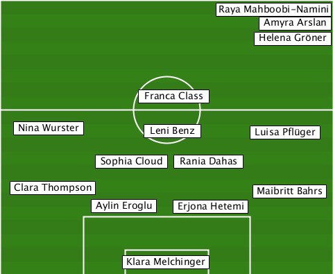 ----------------------Raya Mahboobi-Namini --------------------------Amyra Arslan --------------------------Helena Gröner ---------------Franca Class------ ---Nina Wurster-Leni Benz--Luisa Pflüger -----------Sophia Cloud-Rania Dahas --Clara Thompson-----------Maibritt Bahrs ----------Aylin Eroglu-Erjona Hetemi -------------Klara Melchinger----