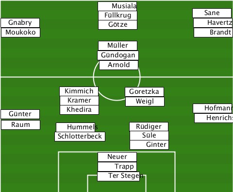---------------Musiala----------- ---------------Füllkrug------Sane- --Gnabry--------Götze---------Havertz --Moukoko--------------------Brandt ---------------Müller------------ ---------------Gündogan---------- ---------------Arnold------------ ----------Kimmich---Goretzka------ --Günter-Raum-Hummels-Kramer-Khedira-Weigl-Rüdiger-Hofmann-Henrichs ---------Schlotterbeck-Süle------- -------------------Ginter-------- ---------------Neuer------------- ---------------Trapp------------- ---------------Ter Stegen--------