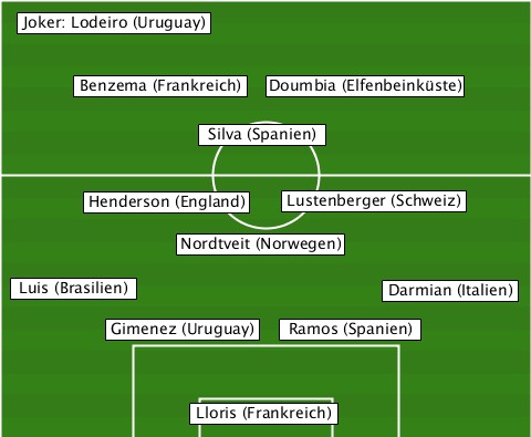 --Joker: Lodeiro (Uruguay)------- ------Benzema (Frankreich)-Doumbia (Elfenbeinküste) -------------Silva (Spanien)----- ------Henderson (England)-Lustenberger (Schweiz) ------------Nordtveit (Norwegen)- --Luis (Brasilien)-------Darmian (Italien) --------Gimenez (Uruguay)-Ramos (Spanien) -------------Lloris (Frankreich)-