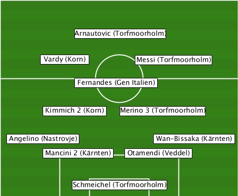 -----------Arnautovic (Torfmoorholm) -------Vardy (Korn)--Messi (Torfmoorholm) -----------Fernandes (Gen Italien) -------Kimmich 2 (Korn)-Merino 3 (Torfmoorholm) --Angelino (Nastrovje)-Wan-Bissaka (Kärnten) -------Mancini 2 (Kärnten)-Otamendi (Veddel) -----------Schmeichel (Torfmoorholm)