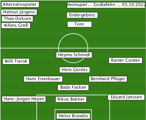 --Alternativspieler:------------- ----------------Heimspiel ... Großefehn ... 05.10.2022 --Helmut Jürgens-Theo Dirksen-Endergebnis: --Alfons Größ----Tore:------------ --------------Heymo Schmidt------ --Willi Tierok------------Rainer Cordes --------------Hero Gerdes-------- -------Hans Eisenhauer-Bernhard Pflüger --------------Bodo Focken-------- --Hans-Jürgen Heyen-Rikus Bokker-Eduard Janssen --------------Heinz Brandes------