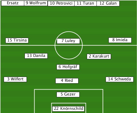 -------9 Wolfrum----------------- --Ersatz------10 Petrovici-11 Turan-12 Galan ---15 Tirsina---7 Luley------8 Imiela -------13 Danila-------2 Karakurt- ---------------6 Hofgräf--------- --3 Wilfert----4 Ried-------14 Schweda ---------------5 Gezer----------- --------------22 Knörnschild-----