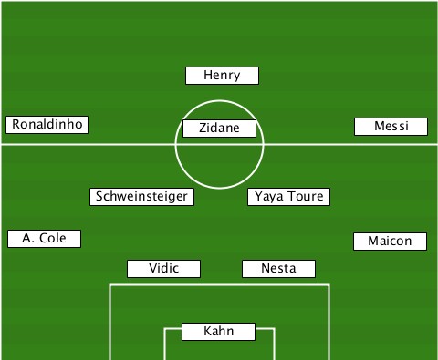 ---------------Henry------------- --Ronaldinho----Zidane-------Messi- --------Schweinsteiger-Yaya Toure- --A. Cole-------------------Maicon -----------Vidic----Nesta--------- ---------------Kahn--------------