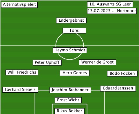 ----------------------10. Auswärts SG Leer --Alternativspieler:------------- ----------------------13.07.2023 ... Nortmoor --------------Endergebnis:------- ----------------Tore:------------ --------------Heymo Schmidt------ ---------Peter Uphoff-Werner de Groot ---Willi Friedrichs-Hero Gerdes-Bodo Focken --Gerhard Siebels-Joachim Brabander-Eduard Janssen --------------Ernst Wicht-------- --------------Rikus Bokker-------