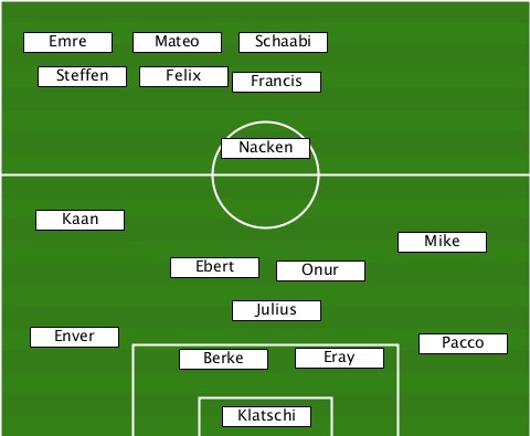 ---------Mateo------------------- ---Emre----------Schaabi---------- ----Steffen-Felix-Francis---------- ---------------Nacken------------ ----Kaan------------------------- -------------------------Mike---- ------------Ebert--Onur----------- ---------------Julius------------ ---Enver-----Berke---Eray-----Pacco- ---------------Klatschi----------