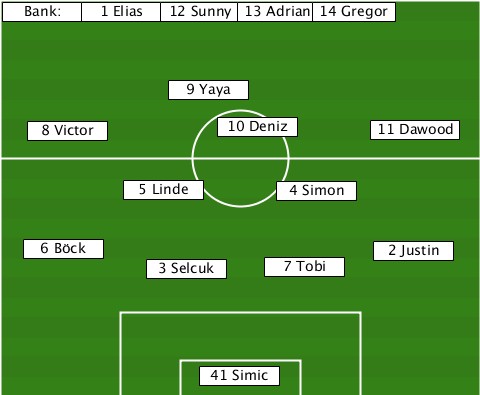 -------1 Elias------------------- --Bank:------12 Sunny-13 Adrian-14 Gregor -------------9 Yaya-------------- ---8 Victor------10 Deniz---11 Dawood ----------5 Linde----4 Simon------ ---6 Böck------------------2 Justin -----------3 Selcuk-7 Tobi-------- ---------------41 Simic----------