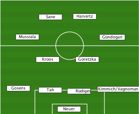 ------------------Harvertz------- ----------Sane------------------- -----Mussiala------------Gündogan- ----------Kroos-----Goretzka------ ---Gosens--Tah-----Rüdiger-Kimmich/Vagnoman ---------------Neuer-------------