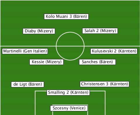 ------------Kolo Muani 3 (Bären)- -------Diaby (Mizery)-Salah 2 (Mizery) --Martinelli (Gen Italien)-Kulusevski 2 (Kärnten) --------Kessie (Mizery)-Sanches (Bären) ----de Ligt (Bären)--Christensen 3 (Kärnten) ------------Smalling 2 (Kärnten)- -------------Szcesny (Venice)----