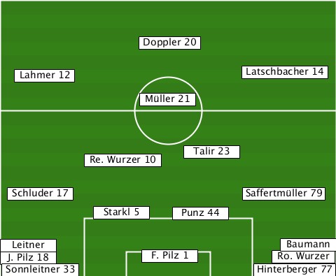 ---------------Doppler 20-------- ---Lahmer 12-------------Latschbacher 14 ---------------Müller 21--------- ---------Re. Wurzer 10-Talir 23--- --Schluder 17-------------Saffertmüller 79 ----------Starkl 5-Punz 44-------- -Leitner---------------------Baumann -J. Pilz 18-----F. Pilz 1----Ro. Wurzer --Sonnleitner 33-----------Hinterberger 77