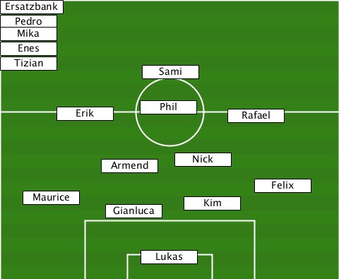 -Ersatzbank---------------------- -Pedro--------------------------- -Mika---------------------------- -Enes---------------------------- -Tizian---------Sami-------------- -------Erik-----Phil-----Rafael---- -----------Armend--Nick----------- -------------------------Felix--- ----Maurice-Gianluca-Kim----------- ---------------Lukas-------------