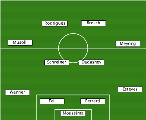 -------------------Bresch-------- -----------Rodrigues------------- ---Musolli------------------Meyong -----------Schreiner-Dadashev----- ---Wenner-------------------Esteves ----------Fall------Ferretti------ ---------------Moussima----------