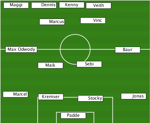 --------------Kenny-------------- --Maggi--Dennis-------Veith-------- ----------Marcus----Vinc---------- ---Max Odwody--------------Baur--- ----------Maik-----Sebi----------- --Marcel---Kremser--Stocky----Jonas- --------------Padde--------------
