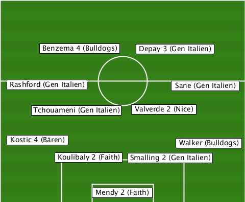 -------Benzema 4 (Bulldogs)------ -------------------Depay 3 (Gen Italien) --Rashford (Gen Italien)-Sane (Gen Italien) ------Tchouameni (Gen Italien)-Valverde 2 (Nice) --Kostic 4 (Bären)-------Walker (Bulldogs) ---------Koulibaly 2 (Faith)-Smalling 2 (Gen Italien) -------------Mendy 2 (Faith)-----