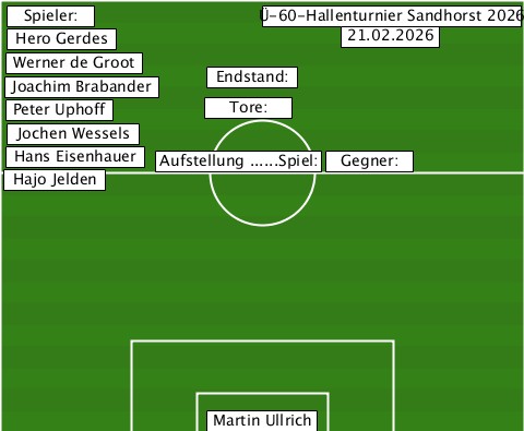 --Spieler:----------------------- -----------------Ü-60-Hallenturnier Sandhorst 2026 --Hero Gerdes----------21.02.2026- --Joachim Brabander-Werner de Groot-Endstand: --Peter Uphoff-Tore:-------------- --Jochen Wessels----------------- --Hans Eisenhauer-Aufstellung ......Spiel:-Gegner: --Hajo Jelden-------------------- --------------Martin Ullrich-----