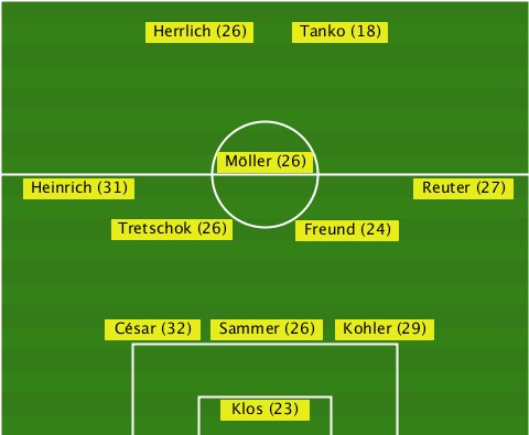 -------------------Tanko (18)---- ----------Herrlich (26)---------- ---------------Möller (26)------- ---Heinrich (31)-----------Reuter (27) --------Tretschok (26)-Freund (24) --------César (32)-Sammer (26)-Kohler (29) ---------------Klos (23)---------