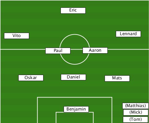 --------------Eric--------------- --Vito---------------------Lennard -----------Paul-----Aaron--------- -----Oskar------Daniel----Mats----- ---------------Benjamin------(Matthias)-(Mick) ----------------------------(Tom)