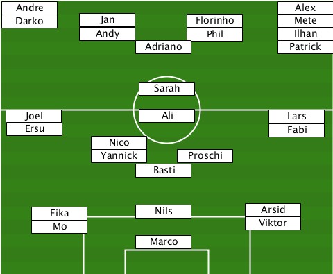 --Andre-------------------------- ----------------------------Alex- --Darko---Jan--------Florinho--Mete- ---------Andy-------Phil------Ilhan --------------Adriano--------Patrick ---------------Sarah------------- --Joel----------Ali----------Lars-- --Ersu----------------------Fabi-- ----------Nico------------------- ----------Yannick--Proschi-------- ---------------Basti------------- -----Fika-------Nils-------Arsid--- -----Mo-------------------Viktor-- ---------------Marco-------------