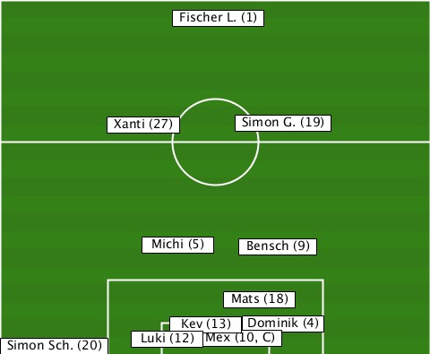 --------------Fischer L. (1)----- ---------Xanti (27)-Simon G. (19)- ------------Michi (5)-Bensch (9)-- ------------------Mats (18)------ --------------Kev (13)-Dominik (4) -Simon Sch. (20)-Luki (12)-Mex (10, C)