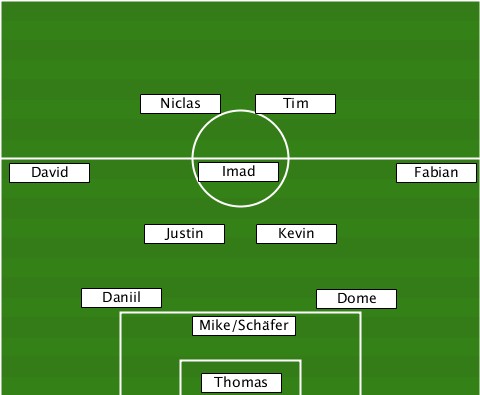 -----------Niclas---------------- ------------------Tim------------ --David---------Imad----------Fabian -----------Justin---Kevin--------- -------Daniil-----------Dome------ --------------Mike/Schäfer------- ---------------Thomas------------